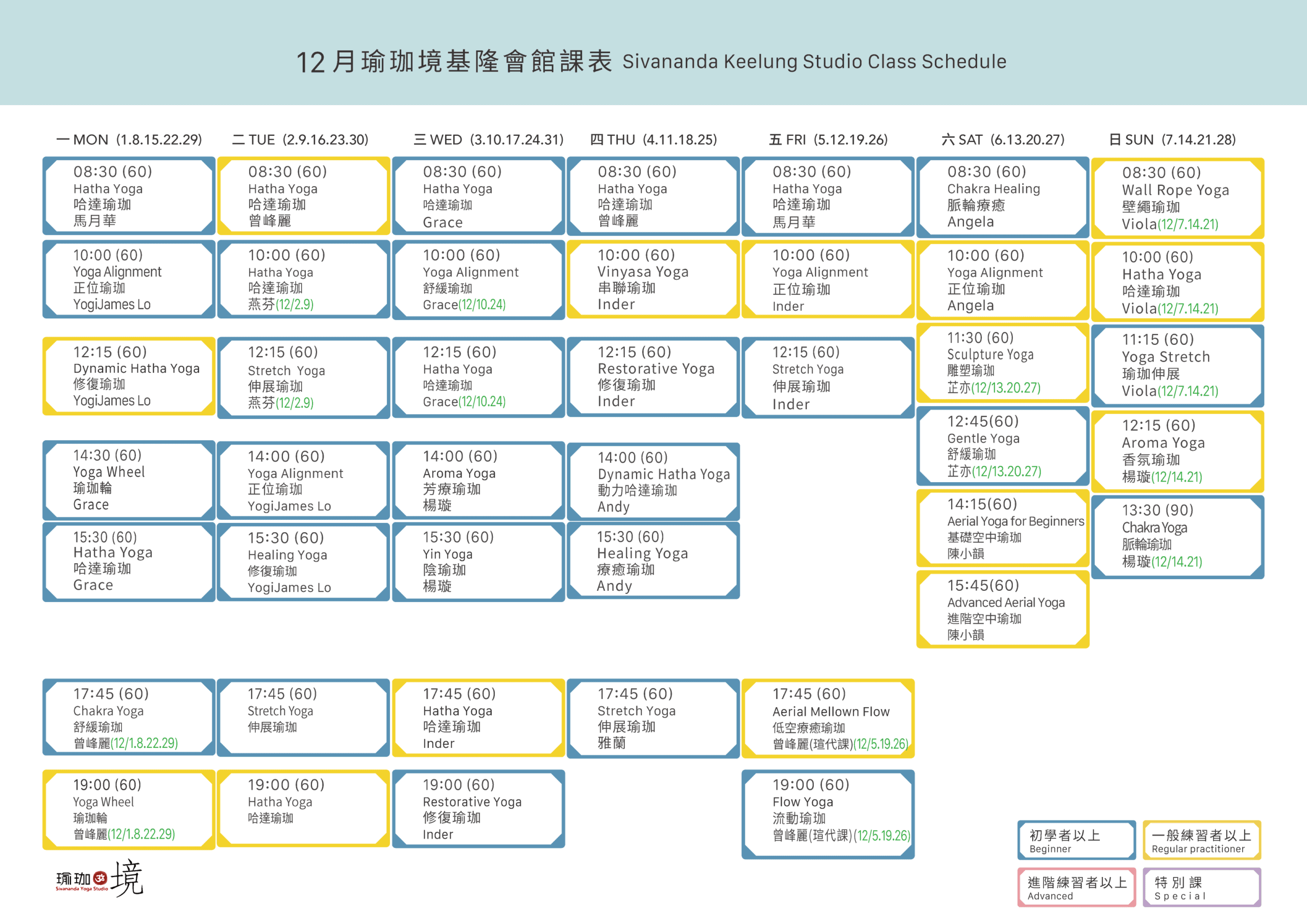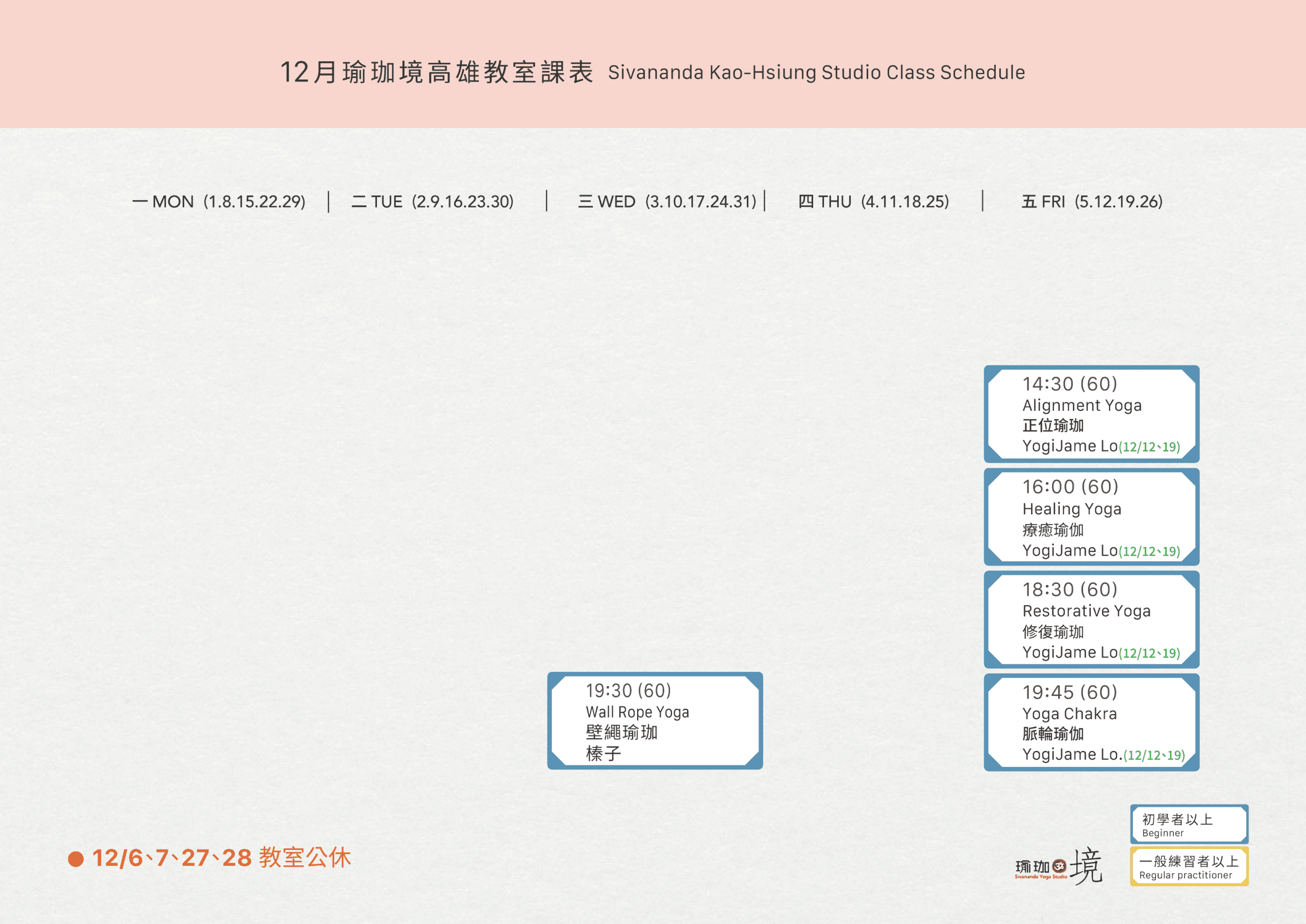 12月大眾課開課囉! 對於初學者來說,先從基礎的體式學起,逐步增加難度,這些動作不僅能幫助打開身體,還能夠提升柔軟度與力量。